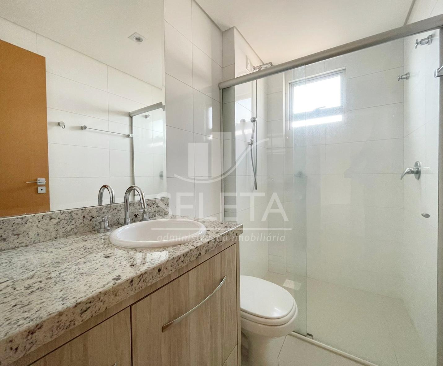 - Banheiro com box em vidro e armário;