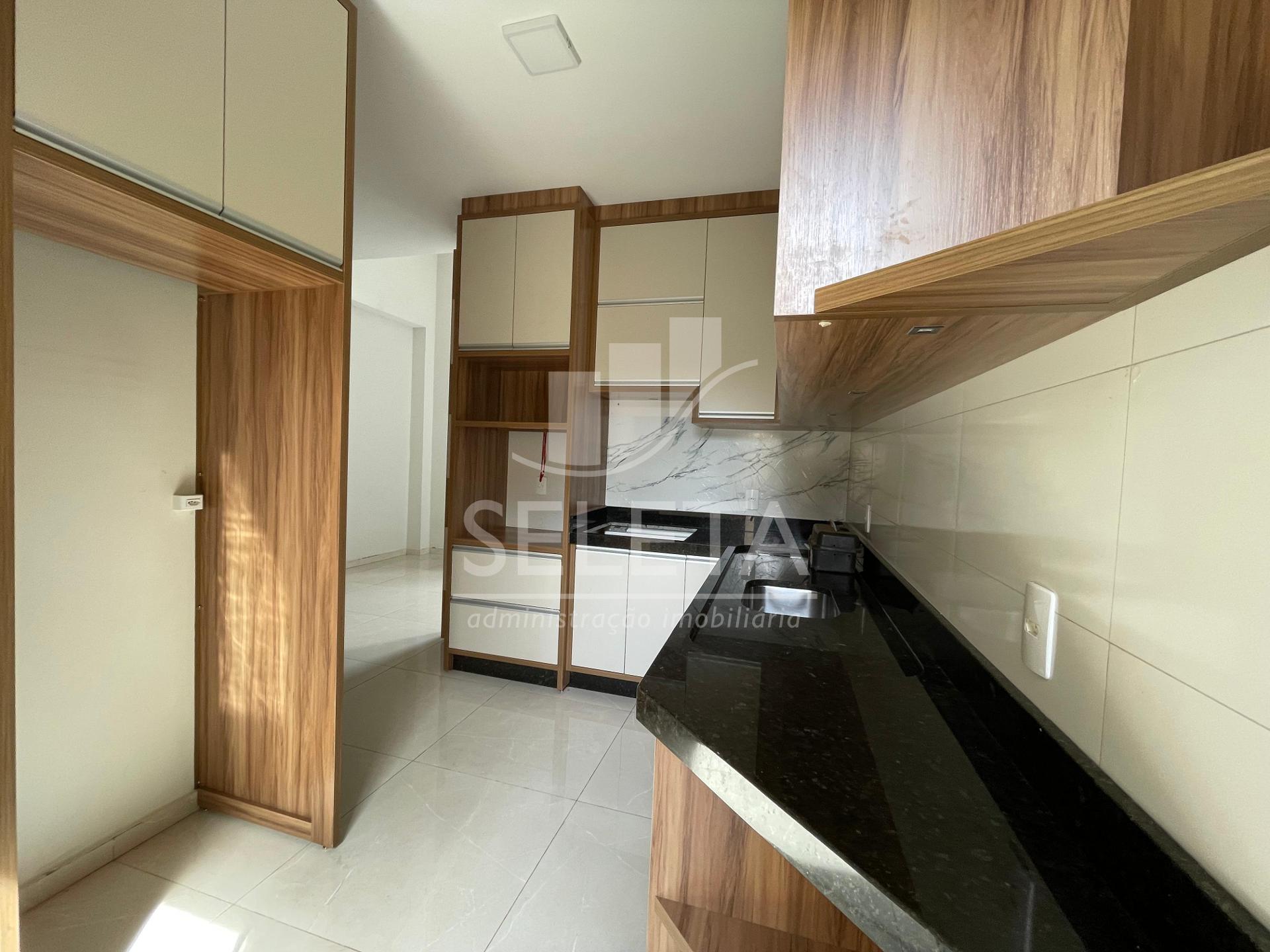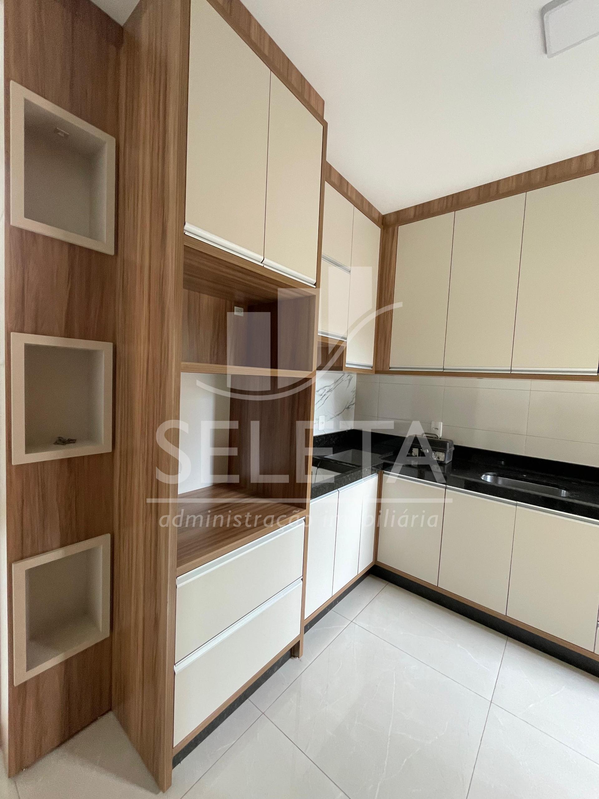A área social integra sala e cozinha planejada, com móveis sob medida, bancada funcional e ótimo espaço para o dia a dia. O acabamento em madeira e tons neutros deixa o ambiente elegante e aconchegante.