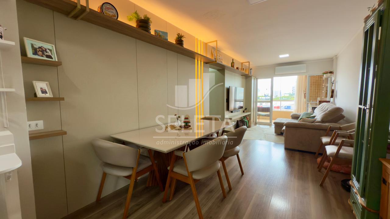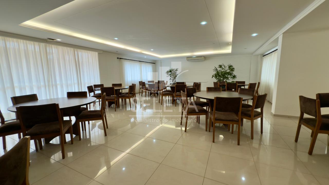 O imóvel possui 190,27m² de área total e 113,15m² de área privativa. É dividido em uma suíte, dois quartos, escritório, sala de estar e jantar, cozinha planejada, sacada com churrasqueira, área de serviço, lavabo e duas vagas de garagem lado a lado com dois depósitos exclusivos. Apartamento todo mobiliado com móveis planejados e ficam 4 ares condicionados.