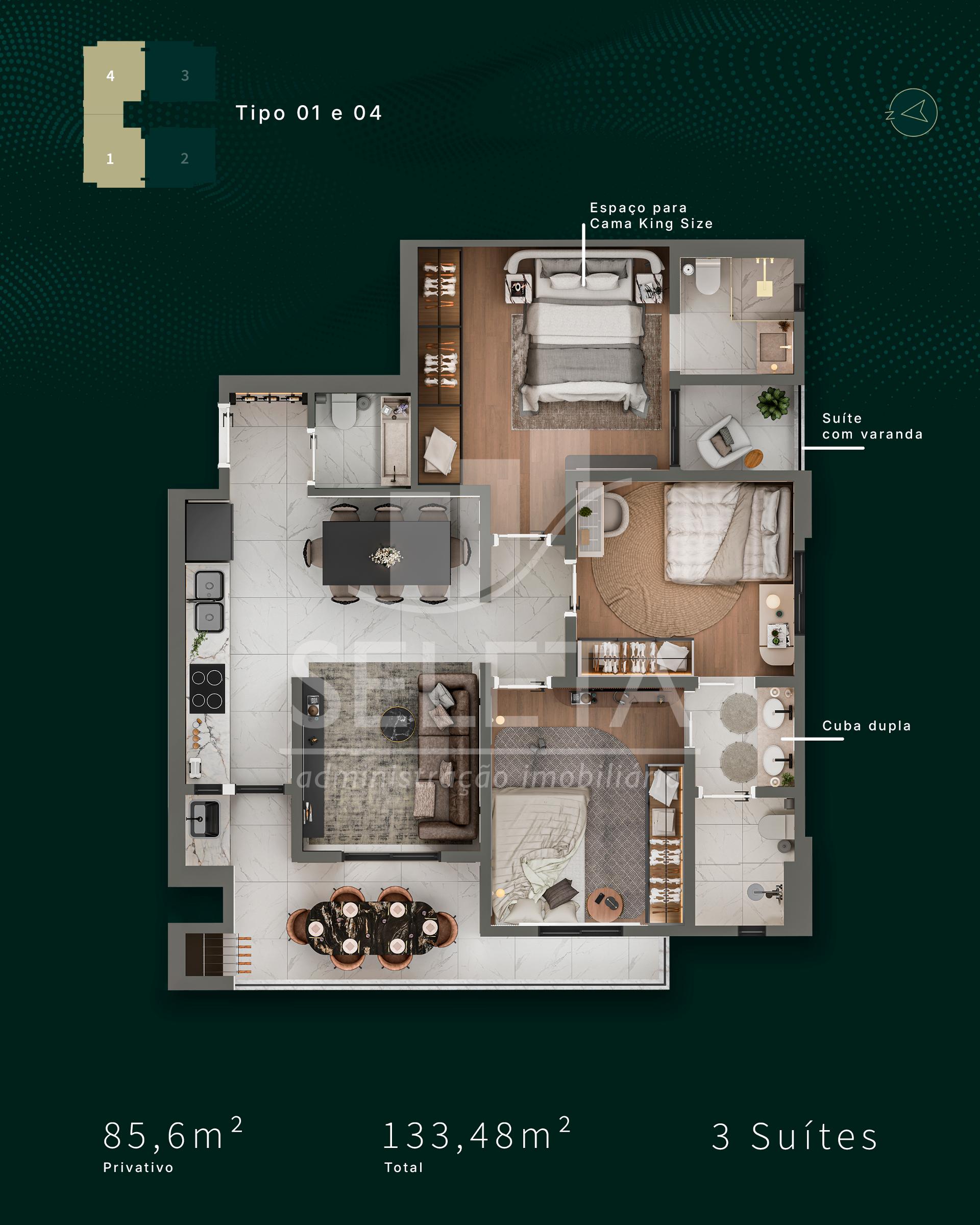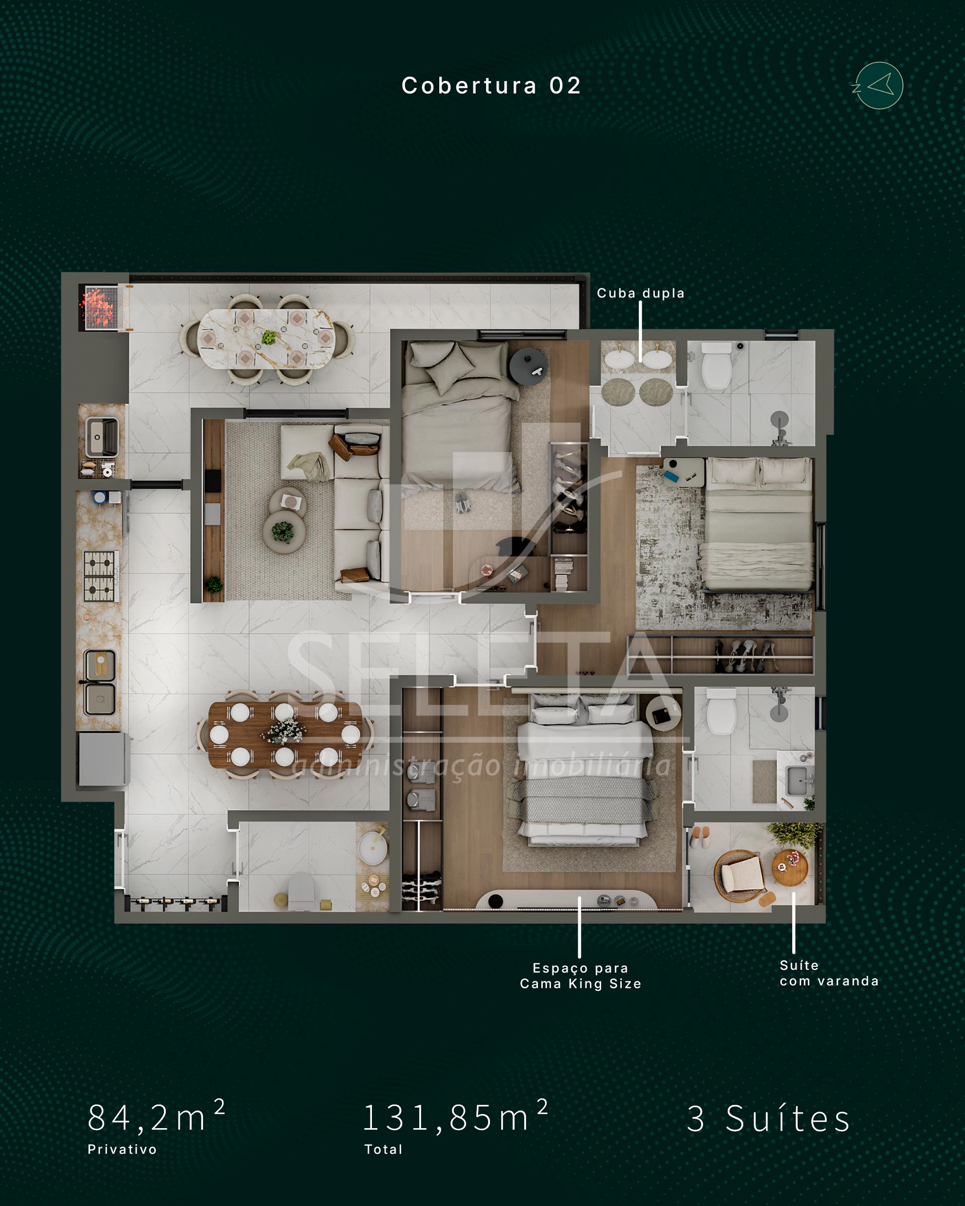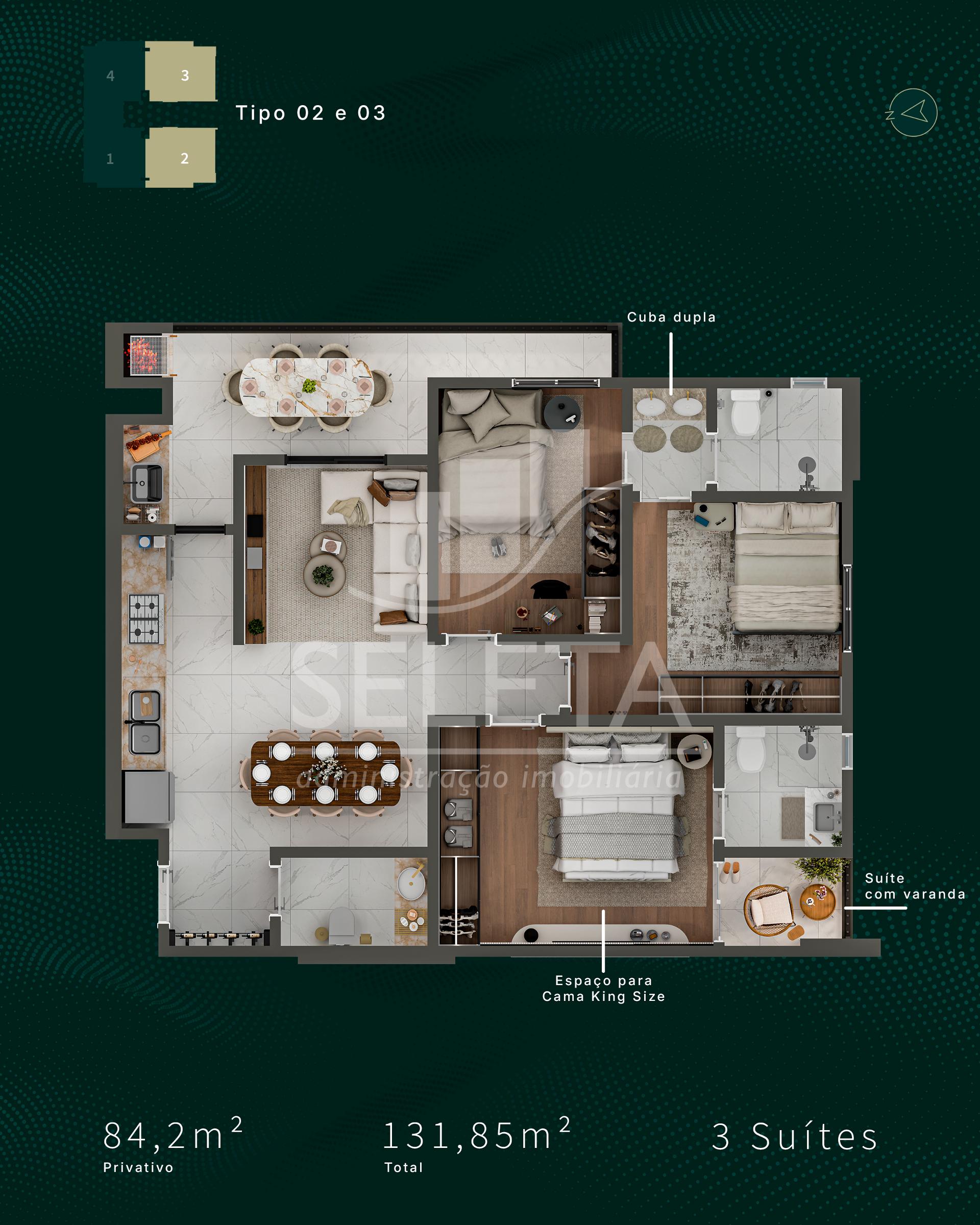 Os apartamentos contam com 3 suítes, plantas inteligentes e excelente aproveitamento dos espaços, com opções que variam entre 84,20 m² a 96,70 m² de área privativa, além de unidades diferenciadas com garden privativo e coberturas exclusivas.