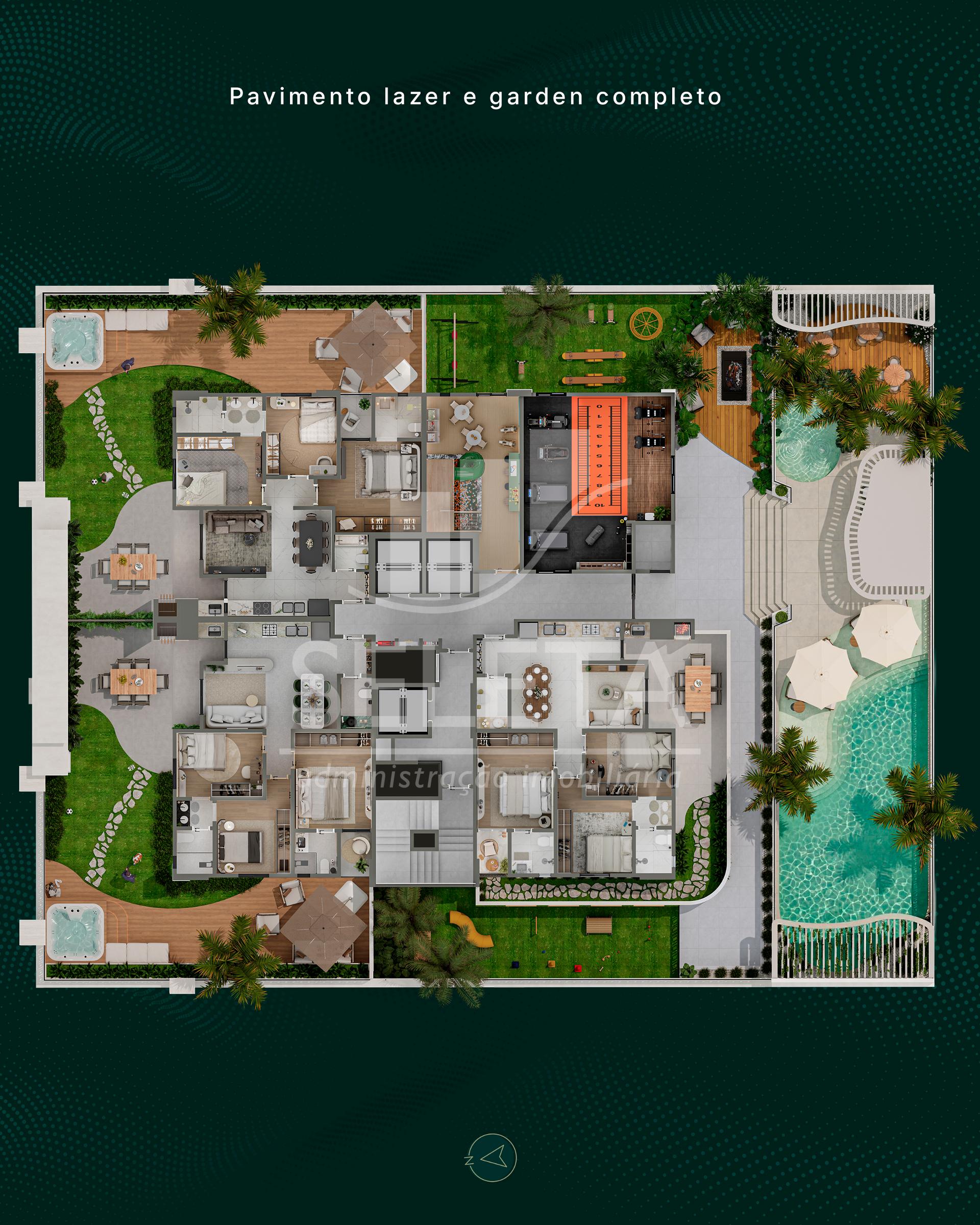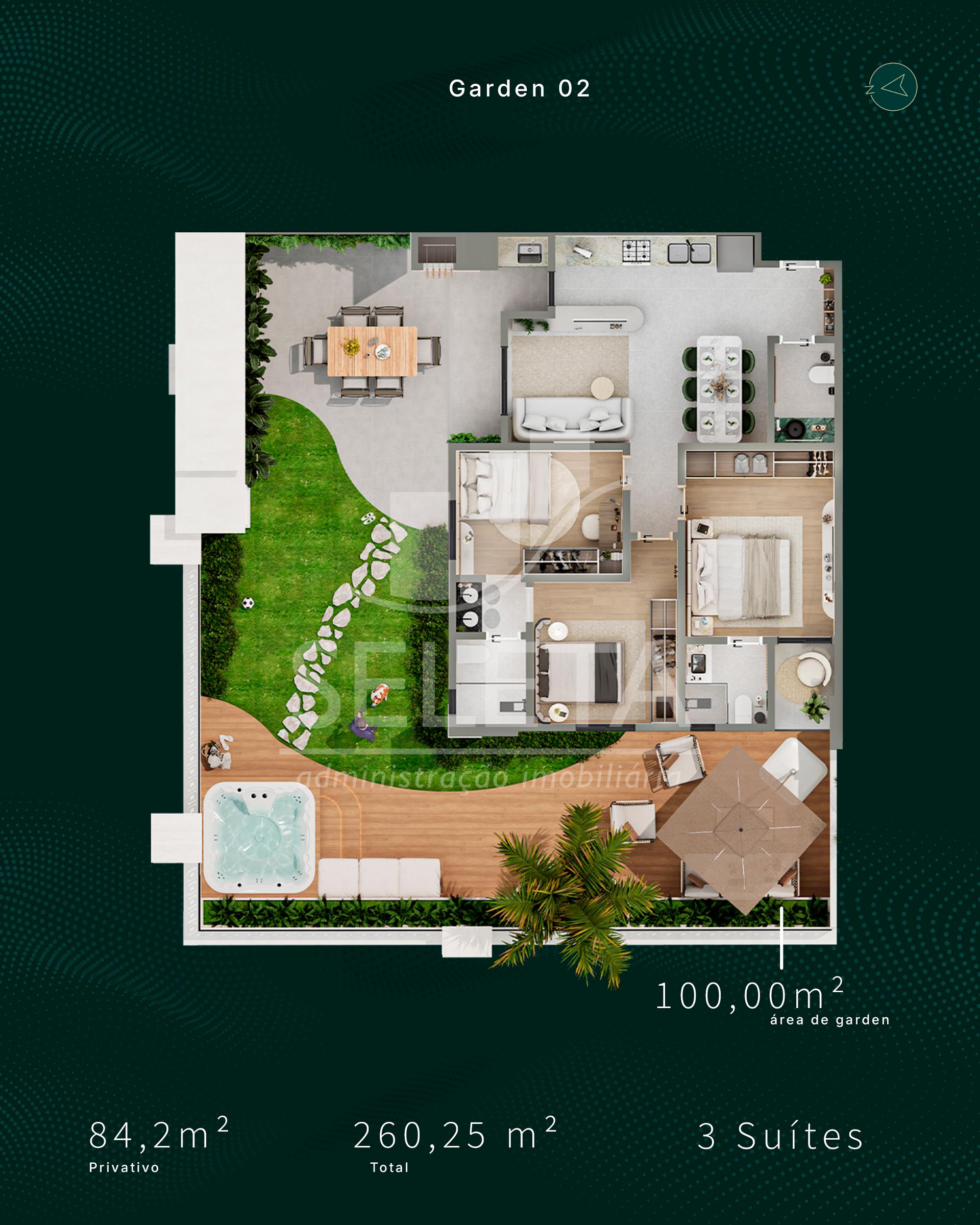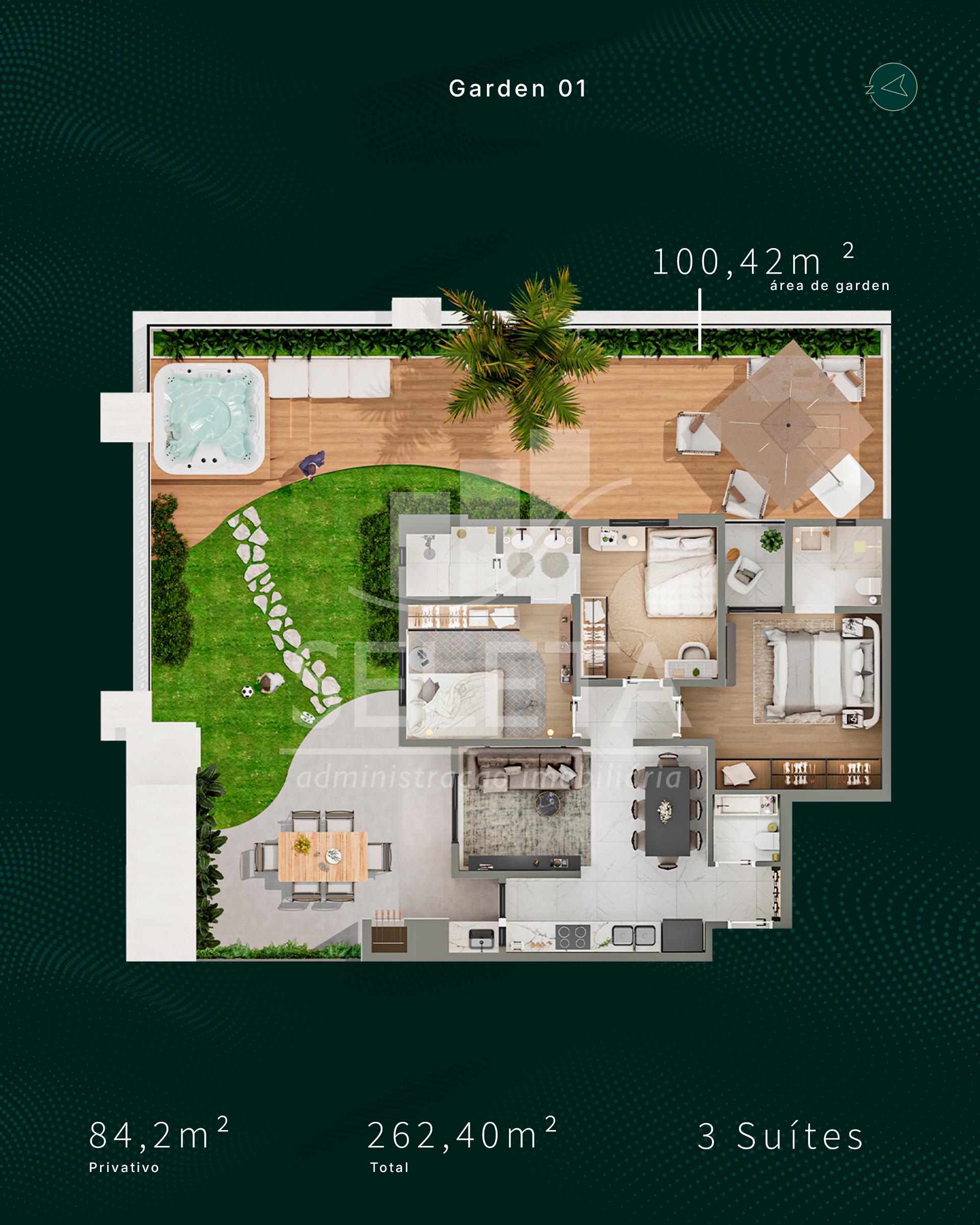 As unidades garden contam com áreas externas privativas que podem chegar a mais de 100 m², ideais para quem busca contato com a natureza, espaço para pets, lazer ao ar livre ou até spa e área gourmet.
