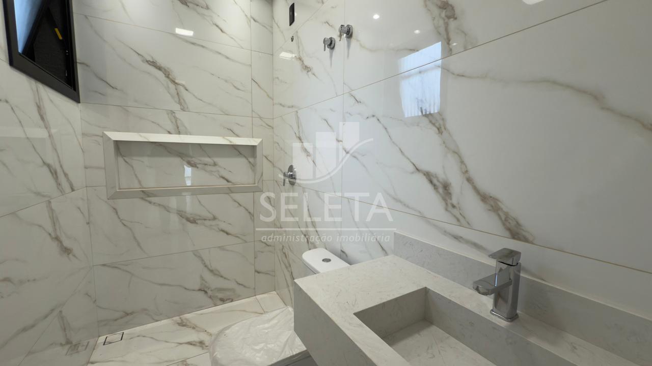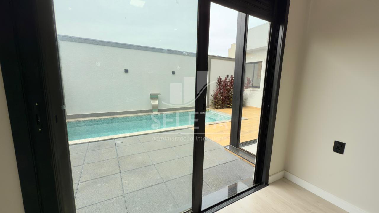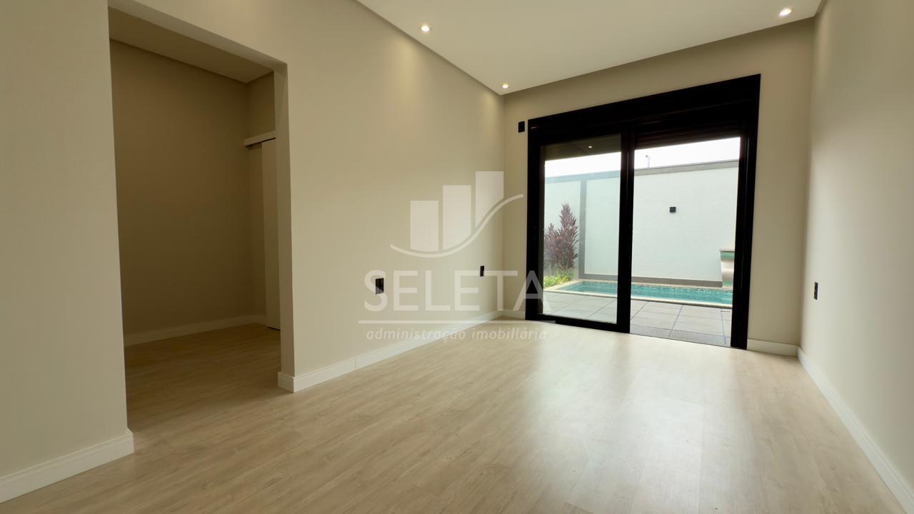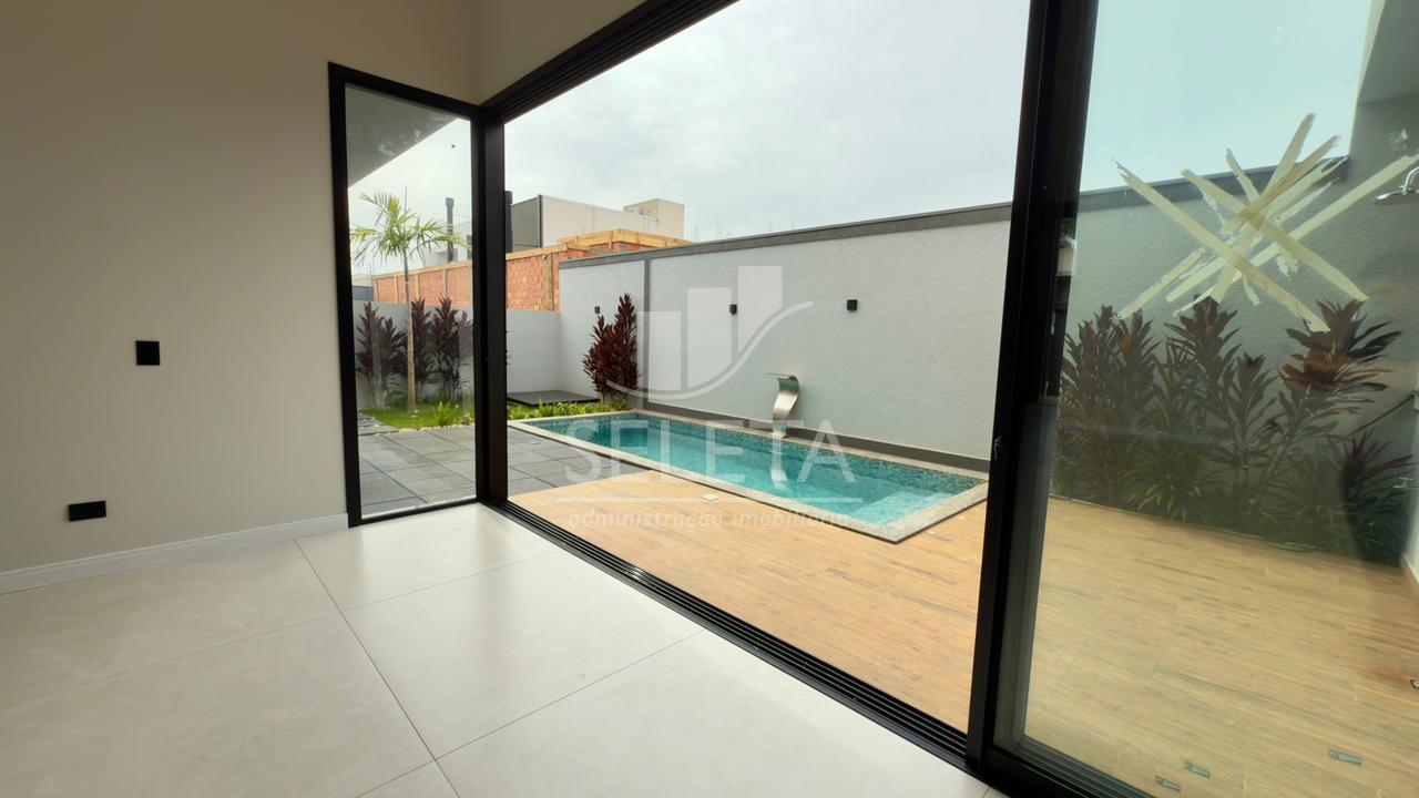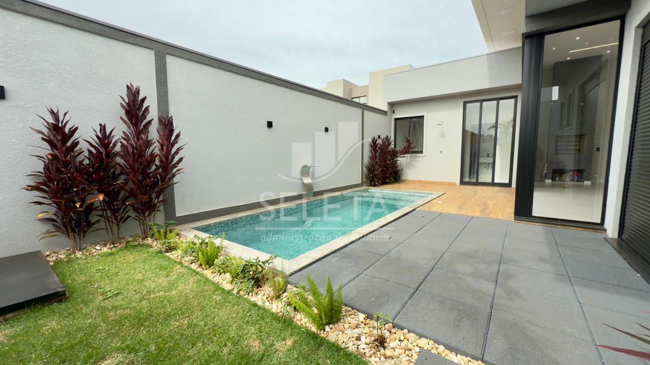 A casa consta com 3 suítes (uma máster com closet e todas possuem persiana elétrica), sala de estar, jantar e cozinha em um mesmo ambiente, piscina, edícula com churrasqueira, lavanderia, lavabo e 4 vagas de garagens.
