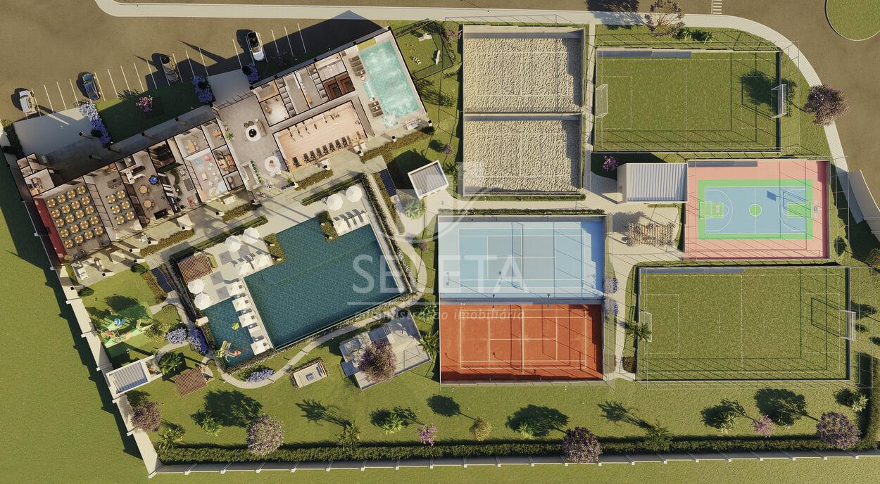 2 quadras de tênis, 2 de areia e 2 campos de futebol